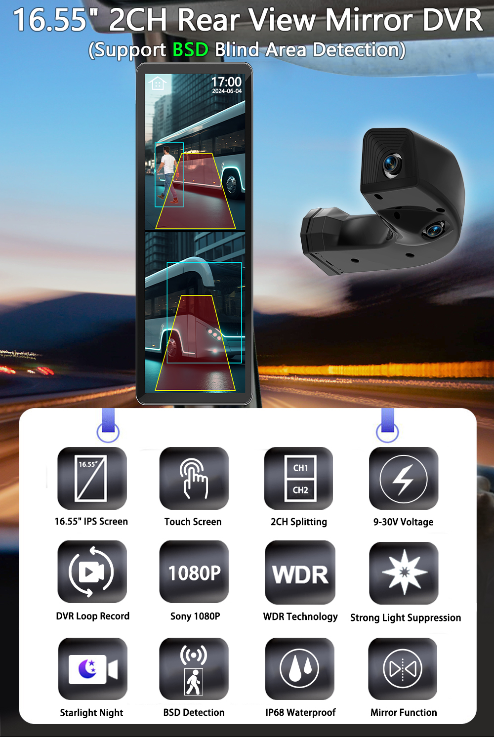 16.55 inch Heavy Duty Truck Digital Mirror Monitor - Sony Sensor/1080P/BSD Blind Spot Detection/Dual Recording