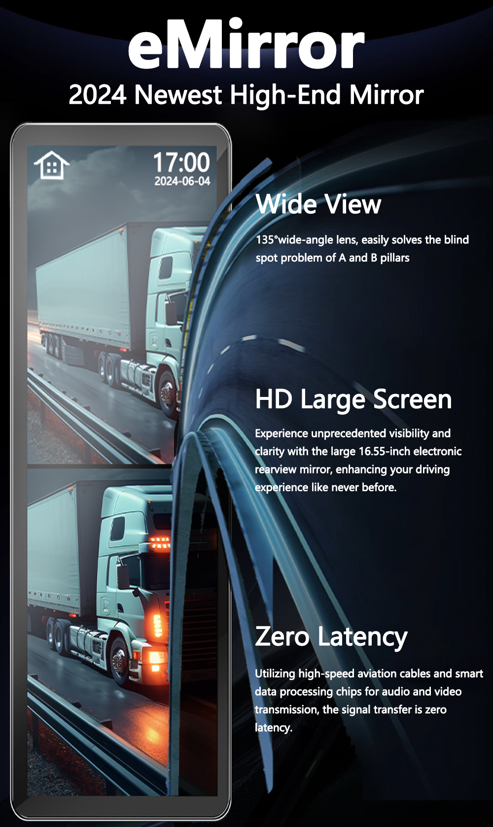 The electronic rearview mirror system integrates the functions of vehicle DVR, camera monitoring, and BSD alarm. It supports a larger viewing angle and higher night vision sensitivity and is easier to adapt to complex weather conditions, which means broader and clearer side vision and more professional safeguarding of driving safety than traditional rearview mirrors.