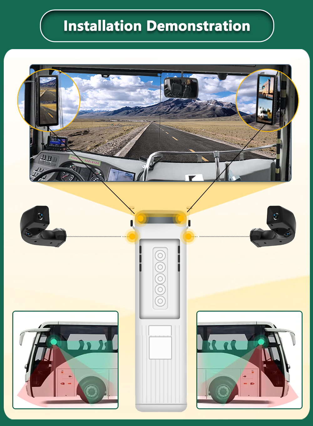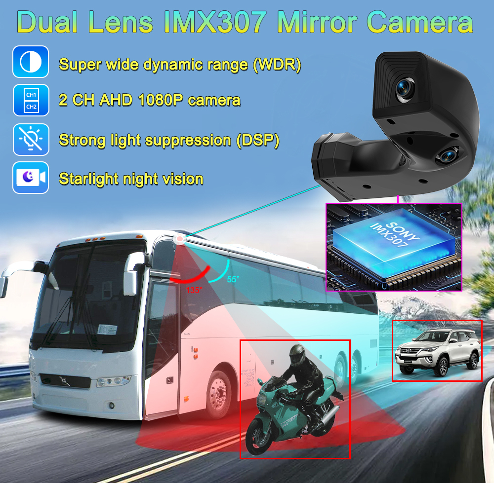 Our camera adopts dual Sony IMX307 lenses with photosensitive chips; one lens is designed for 135° side front viewing to solve the blind spots problem of the A-pillar, side down, and side front of large vehicles, and another lens is designed for 55° side rear viewing. The camera resolution is up to 1920*1080P; equipped with Sony's CMOS, the image is clearer than other 1080P cameras on the market.